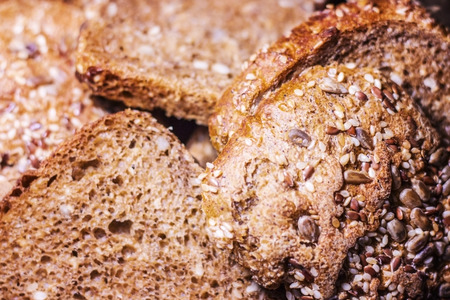 Fresh whole grain seeded bread, organic wheat flour, closeup slice texture as background for food blog or cook book recipes