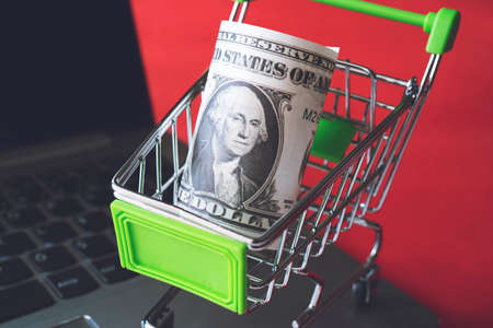 E-commerce concept with dollars, sopping cart and laptop on red background