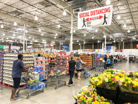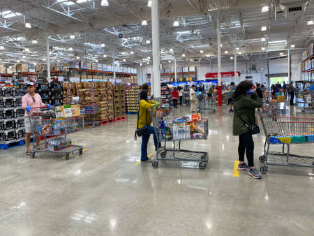 Crowded people waiting in line for checkout at Costco warehouse with social distancing near Dallas, Texas