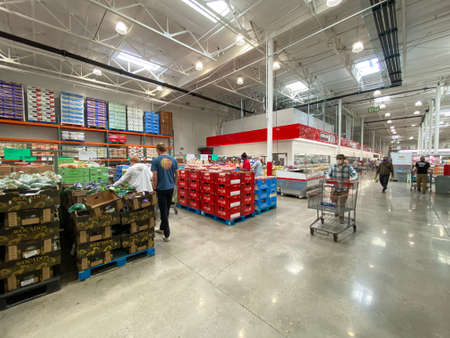 Ailse in a Costco store different products. Costco Wholesale Corporation is the largest membership-only warehouse club in US. . San Diego, USA, April 4th, 2020