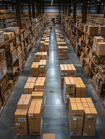 Fully stocked warehouse shelves with large boxes and barcoded labels in every section
