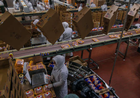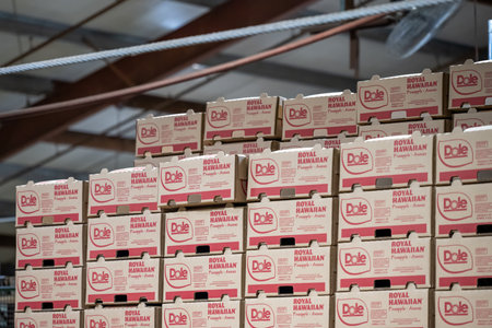 Wahiawa, Hawaii, USA - 4.24.2025: Dole pineapple production with boxed fruit being sorted and moved on conveyor belts