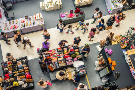 Bangkok, Thailand - July 21, 2018: People walk among stands of Terminal 21 Asok Shopping Mall, a top - down view.