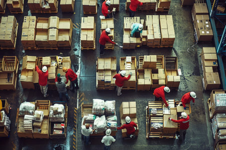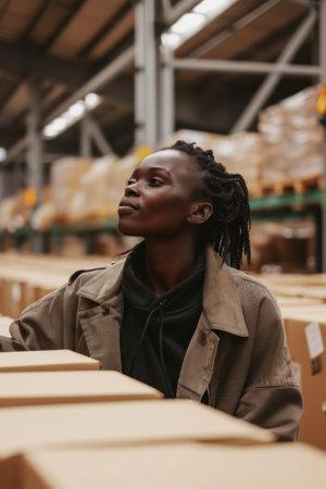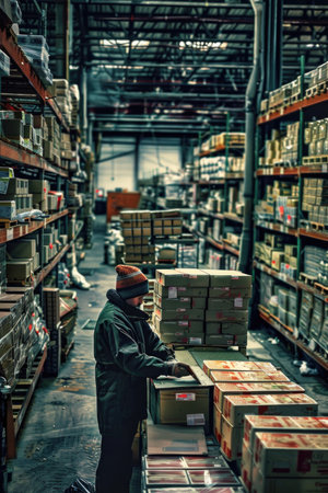 A man is working in a warehouse, surrounded by boxes and shelves. The atmosphere is busy and industrial, with the man focused on his task