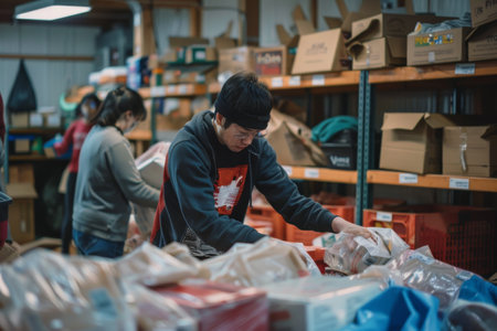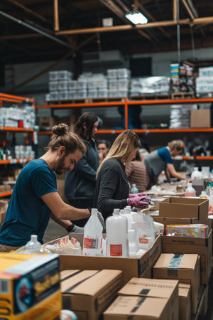 Volunteers Sorting and Packing Donations in a Warehouse for Charity Distribution.