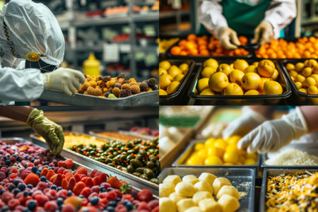 Collage of various fruits like apples, oranges, bananas, and berries in a vibrant display, A collage of different food manufacturing techniques from around the world