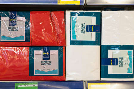 May 12, 2021 Beltsy Moldova supermarket showcase in the picnic department. Paper napkins. Illustrative editorial