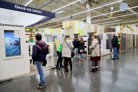 Kirov, Russia - November 23, 2019: Trading hall with goods and people in it in the store Leroy Merlin. Building materials, things for the house and buyers in the big shop
