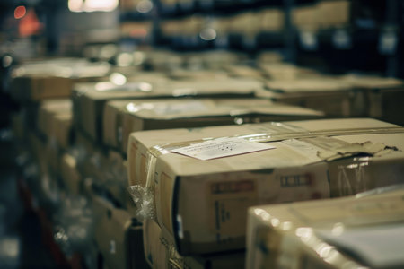 Cardboard boxes with shipping labels are stacked and awaiting shipment and delivery