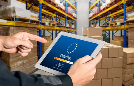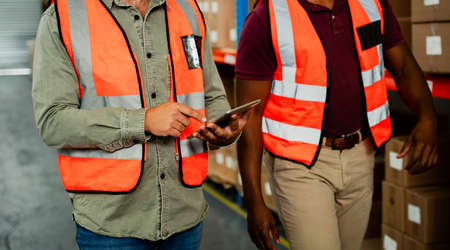 Close up of two colleagues tapping on digital tablet searching for delivery packages in warehouse