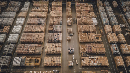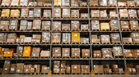 A warehouse filled with neatly stacked boxes and pallets, offering an ideal setting for showcasing logistics and storage concepts.