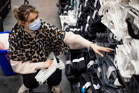 Young woman in medical mask crouches down and selects set of plastic hangers for organizing dressing room space in shopping center. New normal concept. Shopping in epidemic. Order in house. Lifestyle.