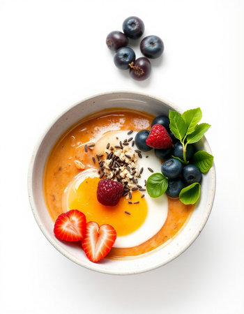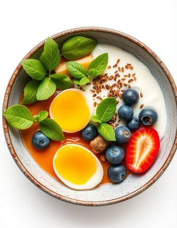Bowl of yogurt with berries and egg on a white background.