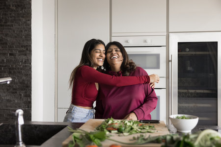 Young loving Indian daughter cuddling tightly her aged mother while preparing healthy vegetarian dish in modern kitchen at home, enjoy cooking process and time together, having good harmonic relations