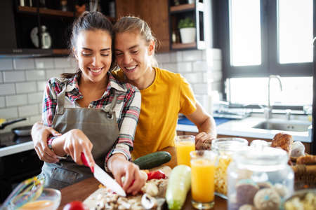 happy young lesbian woman taking photo on smartphone of her girlfriend making salad, banner