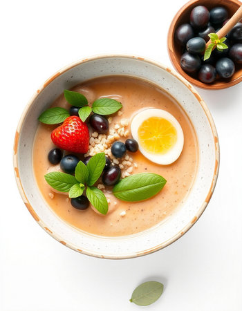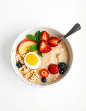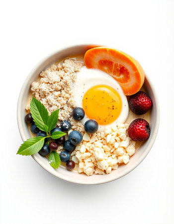 Oatmeal with fresh berries and egg in a bowl on a white background