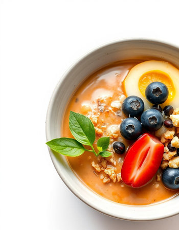bowl of oatmeal with fruit and berries on white background, healthy food