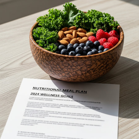 Nutritionist writing a healthy meal plan with fresh fruits, vegetables, and nuts on the table.