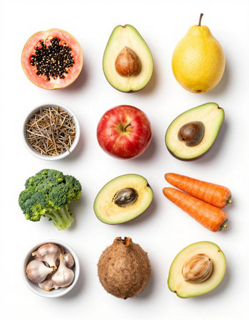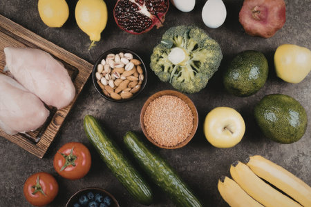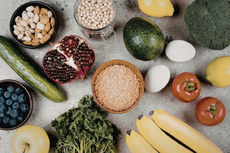 A selection of fresh fruits, vegetables, and healthy grains arranged on a table.