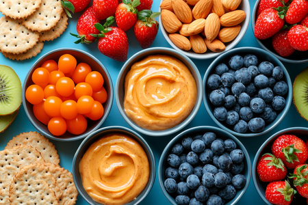 Healthy snacks overhead - nuts and dried fruits with crackers