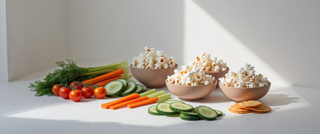 Variation different unhealthy snacks crackers, sweet salted popcorn, tortillas, nuts, straws, bretsels, white marble background copy space