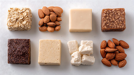 Nuts and oats energy mix bars on white background, top view, copy space, flat lay