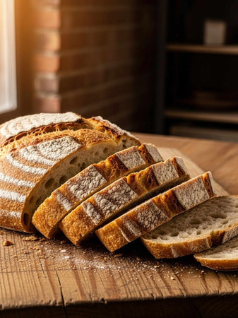 A beautifully sliced loaf of freshly baked sourdough bread on a rustic wooden surface, showcasing its golden crust and airy texture, perfect for culinary inspiration.