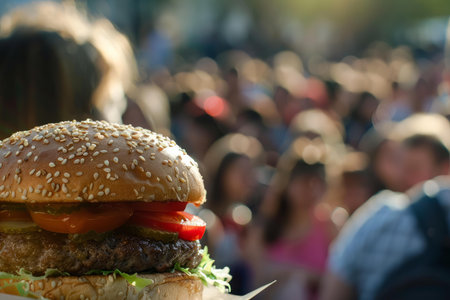Juicy burger in sharp focus with a bokeh of people at an outdoor event