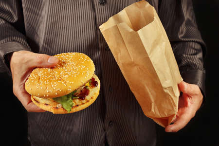 Hands of a man in a black shirt take out a hamburger from a one-time package on a black background