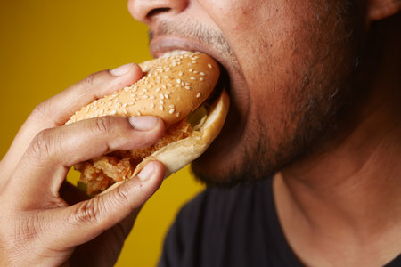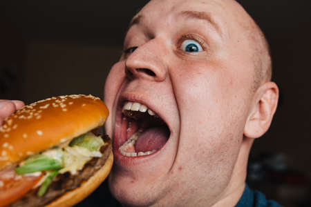 Close-up of man holds and bites hamburger, eating fast food, unhealthy food concept, toned