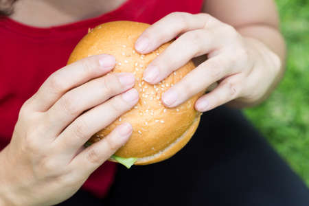 Pretty young woman is eating appetizing hamburger on the street. Close-up