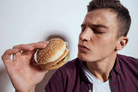 man holding near face hamburger diet food hunger lifestyle fast food light background