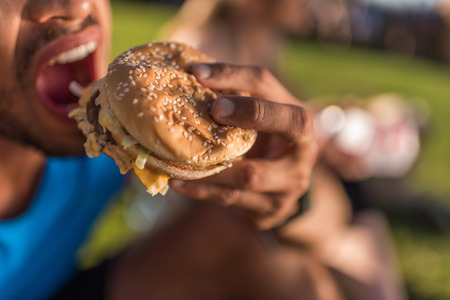 Close up photo of man eating tasty burger with warm sun lighting on background