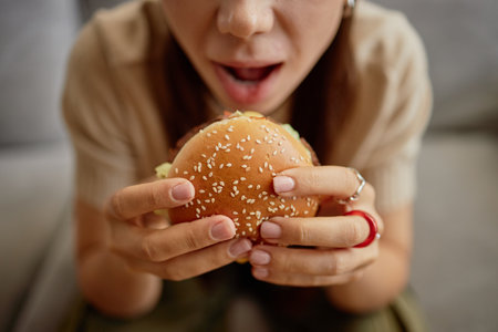 Young adult Caucasian woman holding hamburger with both hands, preparing to take bite, mouth open, sitting indoors, close up on face and hands, casual setting