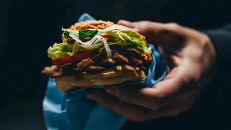 Hand grips a delicious burger in a rustic paper wrapper as night falls, ready for a tasty bite.