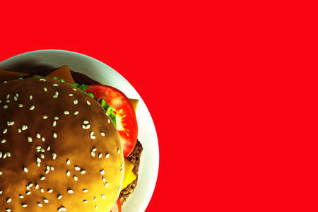 3D rendering cheeseburger with beef, cheese, tomato, lettuce, onion, bacon and sauce on red background. Copy space. Creative or art food concept