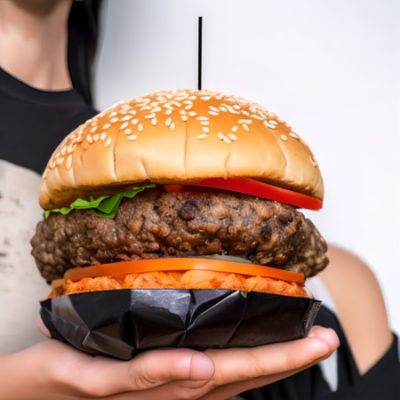 An AI generated illustration of A scrumptious hamburger filled with a variety of fresh vegetables, including red onions and lettuce