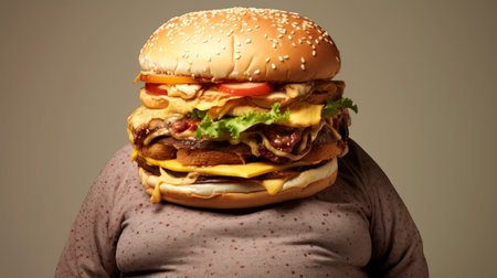 Fat man with hamburger head. Concept of fast food, unhealthy eating, appetite, surreal art, and humor.