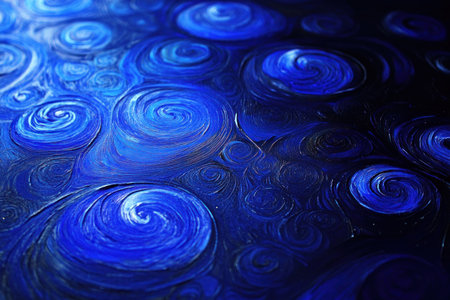 A close-up of the surface texture, showing fine particles and swirls in shades of blue against the deep black water. The scene is illuminated by soft light that highlights these intricate patterns. --ar 3:2 --v 6.1 Job ID: 4c90688c-0178-4d17-8ab5-80028a89ce3c