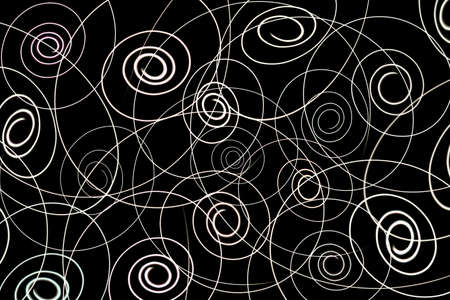 Abstract background with white and gray spirals and flowers on black background