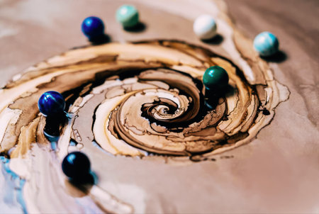 Captivating close-up of an abstract artwork created using the alcohol ink technique, featuring rich earth tones like browns, creams, and deep coffee shades. The central element is a dramatic, hypnotic spiral or vortex, evoking a sense of movement and fluid dynamics. Surrounding the swirl are several small, glossy marble-like spheres in varying shades of blue, green, and white, adding contrast and a three-dimensional element. The organic, flowing textures and high gloss finish create a sophisticated and modern abstract design, suitable for backgrounds, luxury decor, or artistic concepts.