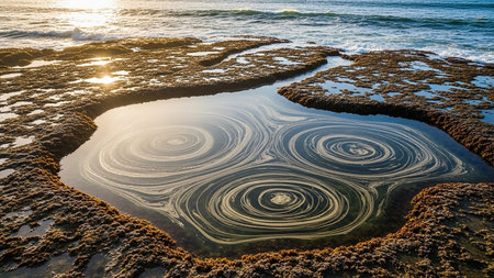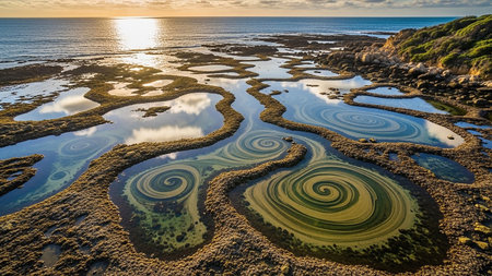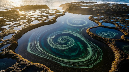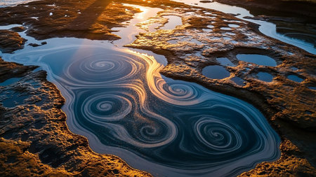 Environmental showing aerial view of tide pools on rocky shoreline with swirling water patterns reflecting golden sunset light keywords: aerial, tide pools, rocky,...