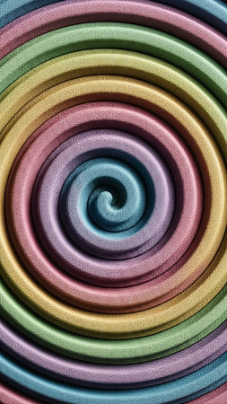 Thick showing close-up of a tightly wound spiral made of thick, textured cord in a rainbow of pastel colors including blue, green, yellow, pink, and purple.