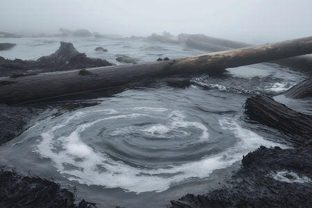 Cold winter day with fog and mist enveloping a river, swirling around rocks and logs, creating a serene and moody atmosphere
