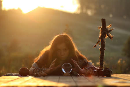 Portrait of Beautiful young long hair woman fortune teller in dark room.