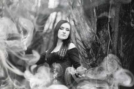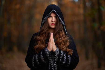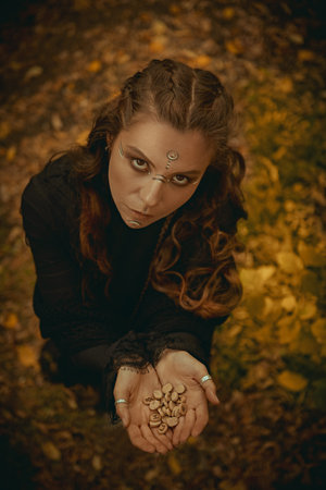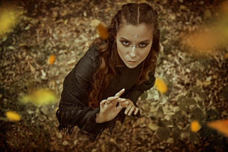 A shaman woman in black garment with ethnic ornaments on her face performs a ritual in an autumn forest. Ethnic culture. Shamanic rituals.