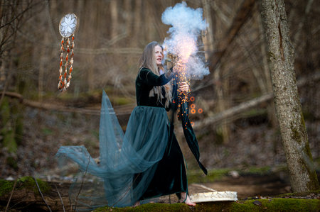 A woman in a green dress lights sparklers in a forest. Shallow depth of feld