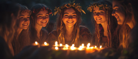 A group of joyful young women gather in a forest celebrating with candles and flowers adorning their hair under a dark sky.