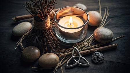 Black magic book. Beautiful occult ritual. Power of earth and stone.