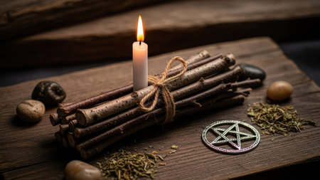AI Generated. A mystical pentagram made of twigs rests on fallen leaves amidst autumnal woods